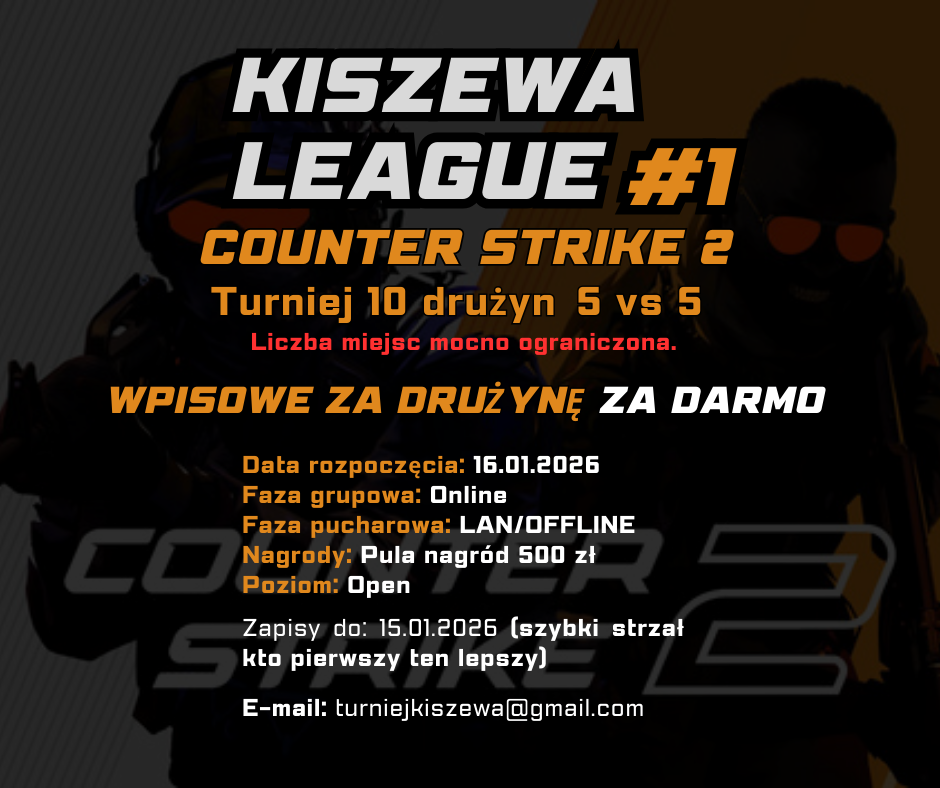 Pierwsza edycja Kiszewa League startuje z turniejem Counter-Strike 2, a naszym celem jest rozwijanie cyklicznych rozgrywek i budowanie aktywnej społeczności graczy.